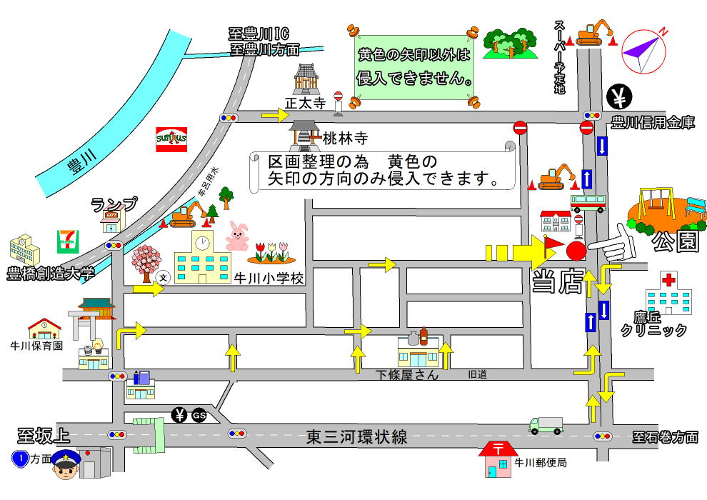 牛川小学校正門前から 東方向へ進み学校の 東角左折 またすぐ右折