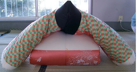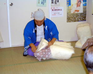 | 大御所の座布団のわたを張っているところ。 | 座布団の側の裏返す所です。 |