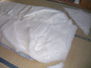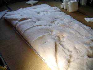 3枚目は、体を反対方向に向け1枚目と同じようにわたを開きます。 これで1段目の台張りは終わりですが多分隙間が開いているところがあると思います。 この時は、わたを縦切りして隙間を埋めます。