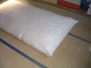 手作り敷ふとんはこのように1枚1枚綿を張って作り上げます。