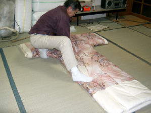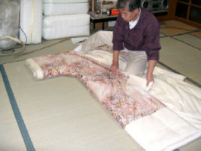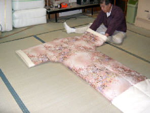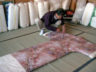 上前の のしつけ 作業 綿を生地に含ませる工程です。